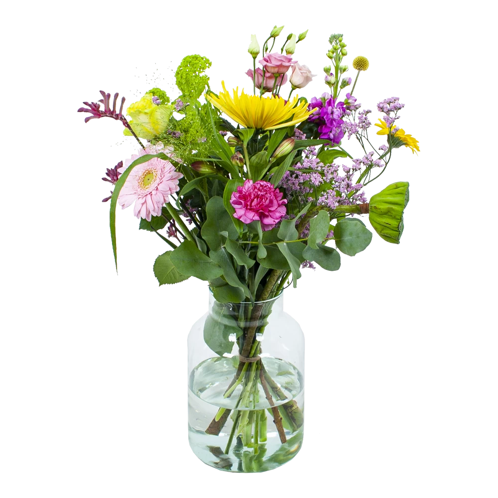 De combinatie van de kleurrijke gele en roze bloemen geven het veldboeket een zomerse en vrolijke uitstaling. Een boeket dat in elke ruimte gezelligheid creëert. Bovendien geschikt voor verschillende gelegenheden. Feliciteer, bedankt of verstuur zomaar dit prachtige handgebonden boeket en verras de ontvanger! * Exclusief accessoires en vaas