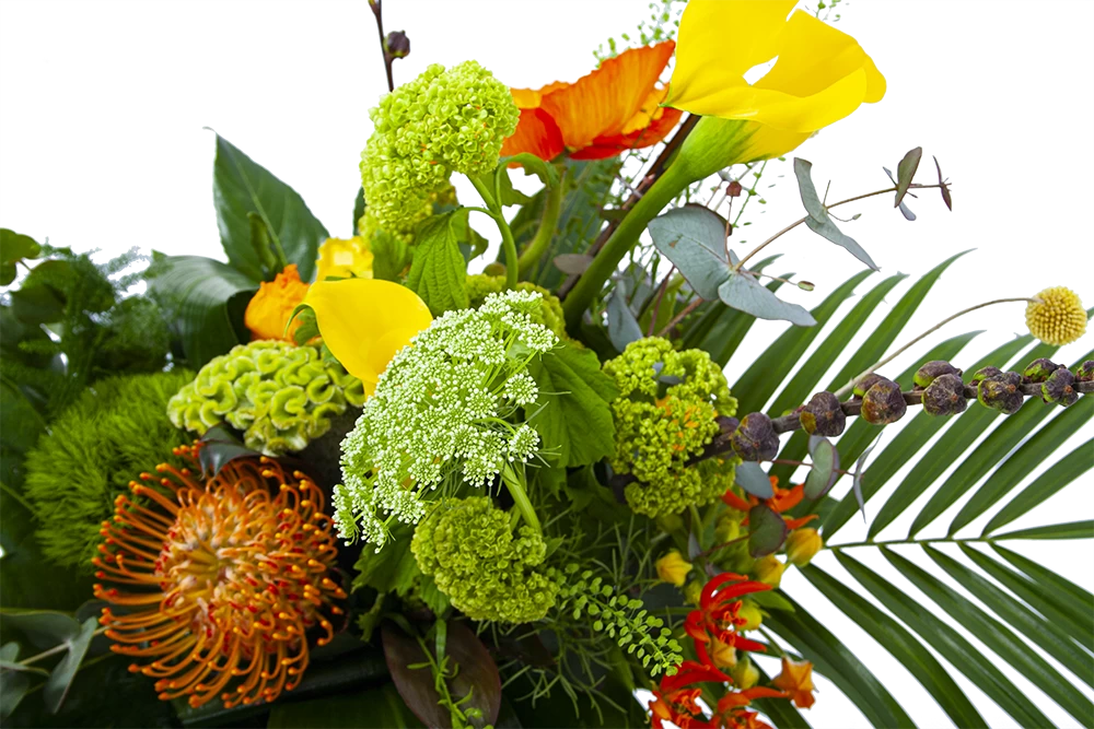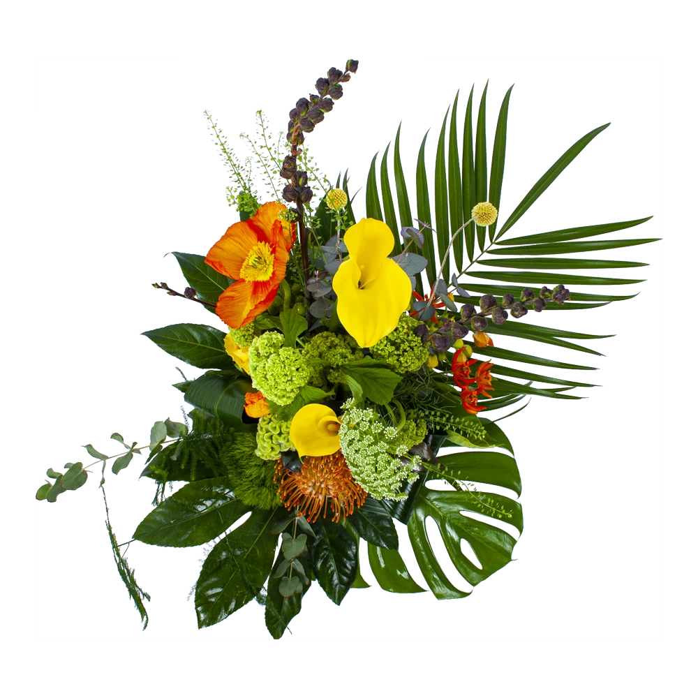 Dit bladboeket diverse prachtige bloemen. De combinatie van de verschillende gele, oranje en groene bloemen geven het boeket unieke uitstraling. Een boeket dat in vrijwel elk interieur past. Bovendien geschikt voor verschillende gelegenheden. Feliciteer, bedankt of verstuur zomaar dit prachtige handgebonden boeket en verras de ontvanger! * Exclusief accessoires en vaas