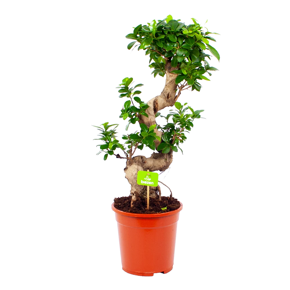 Het Japanse woord Bonsai betekent letterlijk: boom in pot. De Ficus Microcarpa Ginseng is een plant voor binnen en dus een huiskamer bonsai. HIj valt op door zijn eigenzinnige en dikke stam en glanzende bladeren. Plaats de Ficus op een lichte plek en bij voorkeur dichtbij het raam. Houd de grond licht vochtig, maar geef de Bonsai niet te veel water.