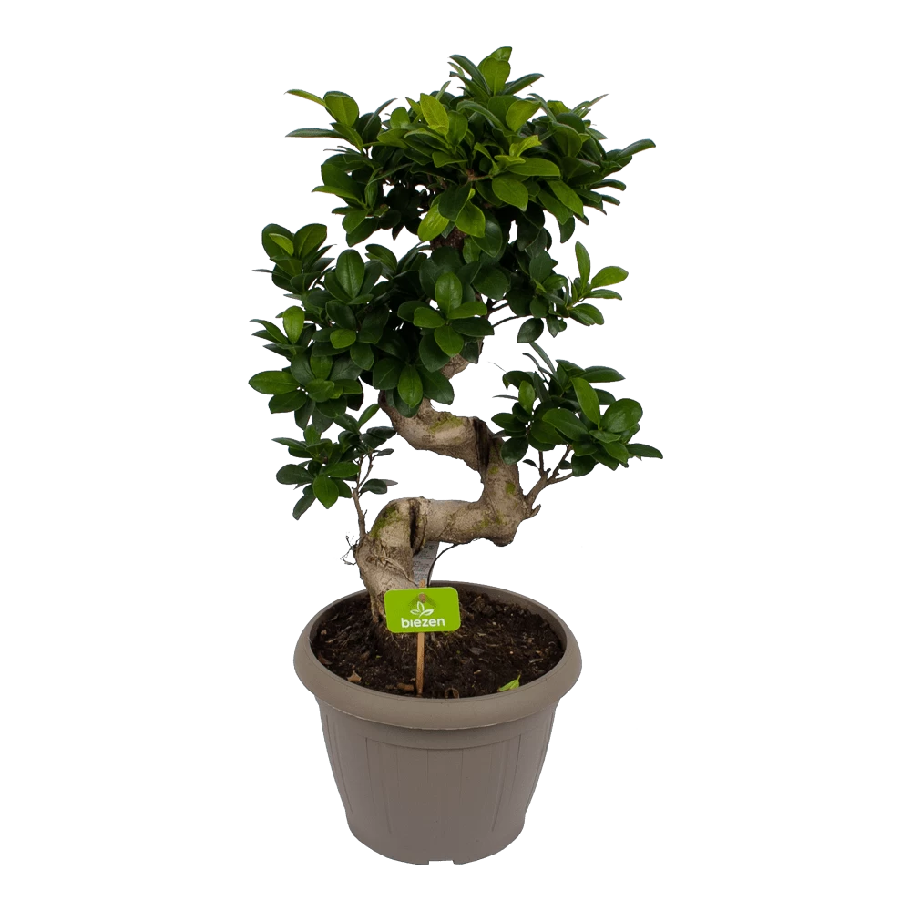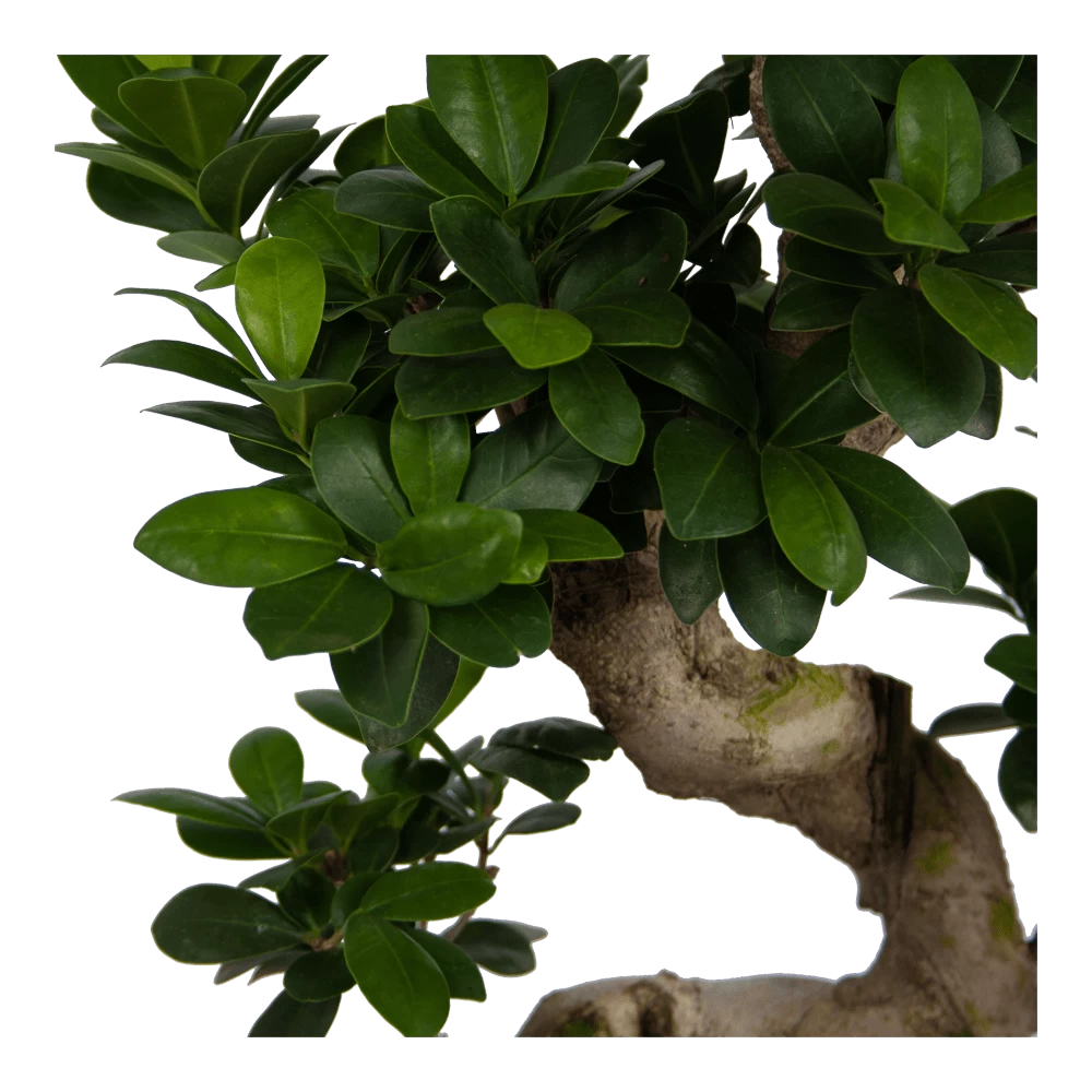 Het Japanse woord Bonsai betekent letterlijk: boom in pot. De Ficus Microcarpa Ginseng is een plant voor binnen en dus een huiskamer bonsai. HIj valt op door zijn eigenzinnige en dikke stam en glanzende bladeren. Plaats de Ficus op een lichte plek en bij voorkeur dichtbij het raam. Houd de grond licht vochtig, maar geef de Bonsai niet te veel water.