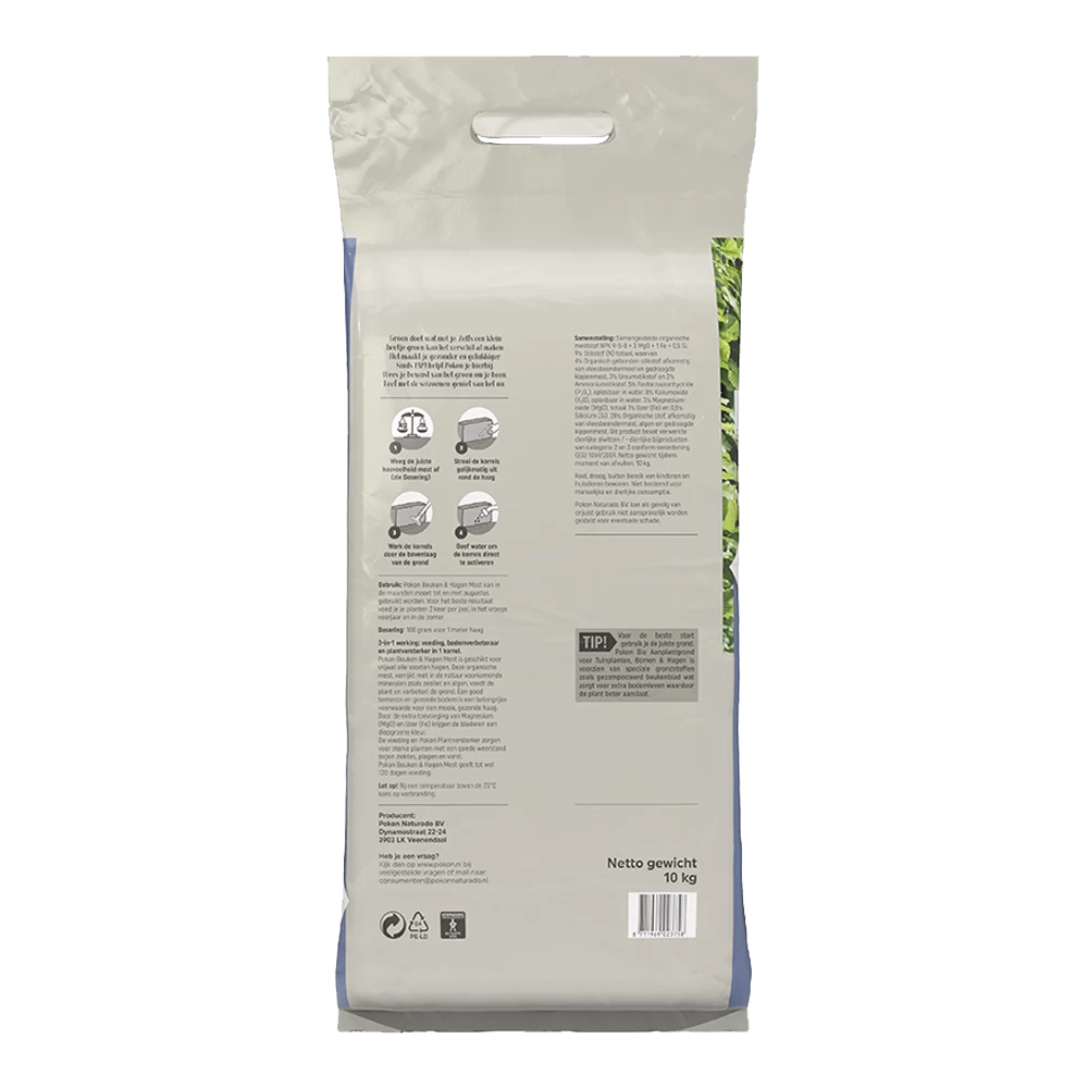 3-in-1 werking: voeding, bodemverbeteraar en plantversterker in 1 korrel. Pokon Beuken & Hagen Mest is geschikt voor vrijwel alle soorten hagen. Deze organische mest, verrijkt met in de natuur voorkomende mineralen zoals zeoliet en algen, voedt de plant en verbetert de grond. Een goed bemeste en gezonde bodem is een belangrijke voorwaarde voor mooie, gezonde haag. Door de extra toevoeging van Magnesium (Mg0) en IJzer (Fe) krijgen de bladeren een diepgroene kleur. De voeding en Pokon Plantenversterker zorgen voor sterke planten met een goede weerstand tegen ziektes, plagen en vorst. Pokon Beuken & Hagen Mest geeft tot wel 120 dagen voeding. Pokon Beuken & Hagen Mest kan in de maanden maart t/m augustus gebruikt worden. Voor het beste resultaat voed je je planten 2 keer per jaar, in het vroege voorjaar en in de zomer.