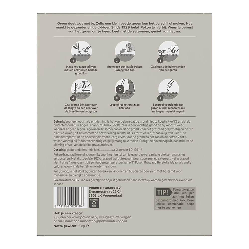 Pokon Graszaad Herstel is geschikt voor het herstel van je gazon, zowel van kale plekken als na het verticuteren. Met dit speciale SOS-graszaad wordt je gazon weer supersnel egaal groen. Het graszaad kiemt al na 1 week, zelfs bij een bodemtemperatuur van 6°C. Pokon Graszaad Herstel is ideaal als snelle oplossing, ook in de herfst- en wintermaanden. Voor een optimale ontkieming is het van belang dat de grond niet te koud is (+6°C.) en dat de buitentemperatuur hoger is dag 15°C (max 25°C). Zaai in een vochtige grond en bij windstil weer. Wanneer er geen regen is gevallen, besproei dan eerst de grond. Zaai het graszaad gelijkmatig en niet te dicht op elkaar, dit belemmert de ontwikkeling. Kiemduur is 1 tot 2 weken, afhankelijk van lucht- en bodemtemperatuur en hoeveelheid vocht. Zorg ervoor dat de grond na het zaaien de eerste 2 tot 4 weken vochtig blijft door voorzichtig en gelijkmatig te sproeien. Droogt de bovenlaag uit, dan mislukt de kieming of sterven de kleine grasplantjes af.