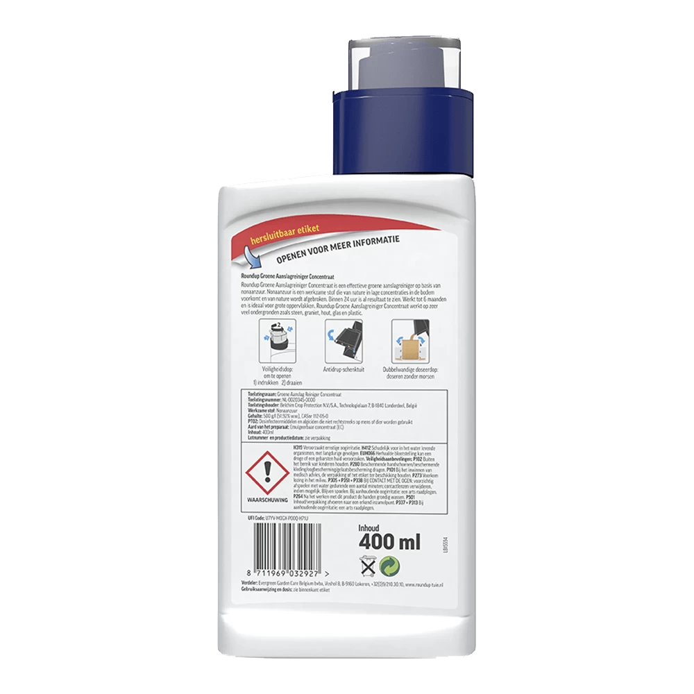 ROUNDUP® Groene Aanslagreiniger Concentraat 400ml is een effectieve groene aanslagverwijderaar op basis van nonaanzuur. Nonaanzuur is een werkzame stof die van nature in lage concentraties in de bodem voorkomt en van nature wordt afgebroken. Binnen 24 uur is al resultaat te zien. Werkt tot 6 maanden en is ideaal voor grote oppervlakken. ROUNDUP ® Groene Aanslagreiniger Concentraat werkt op zeer veel ondergronden zoals steen, graniet, hout, glas en plastic.