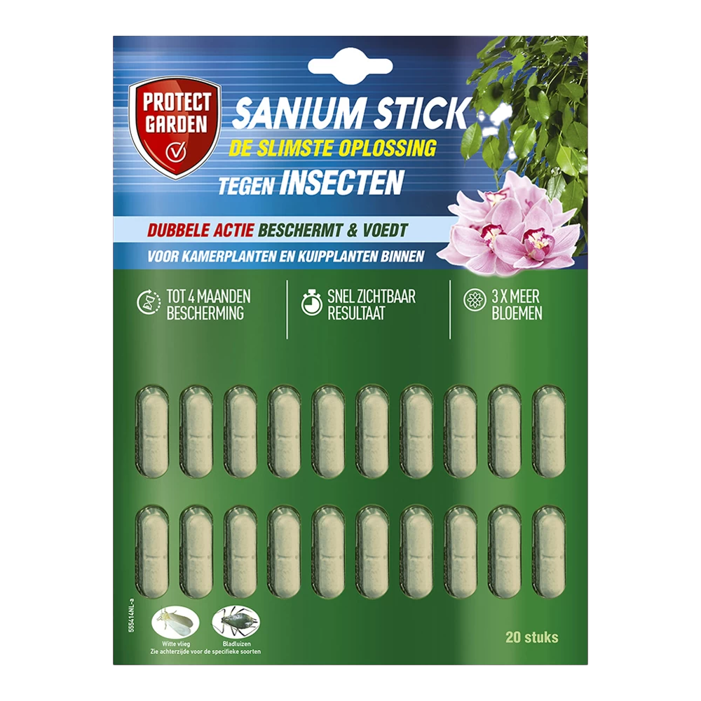Sanium stick tegen insecten op kamerplanten en kuipplanten binnen. Sanium is de nieuwe norm voor insectenmiddelen. Het product is door zijn systemische werking effectief tegen schadelijke insecten en tegelijkertijd vriendelijk voor nuttige insecten. Sanium stick kan worden toegepast op kamerplanten en kuipplanten tegen bladluizen en witte vlieg en is voorzien van een meststof voor meer bloei.